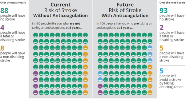 What’s a physician to do? A key aspect of shared decision-making involves patient decision aids, adding a more objective or illustrative aspect to the difficult conversation. Based on specific data points of the patient, a personalized risk profile can be generated. Yet, we know that from a human-centered design perspective, percentages and dry calculations can be difficult to truly internalize. Incorporating graphics into the mix can make all the difference. For example, it’s one thing to know that a potential intervention (in this case, taking anticoagulation medication) will decrease the risk of stroke by almost half (from 12% to 7%), yet another thing to see a graphical representation. Here’s one example from the literature:
